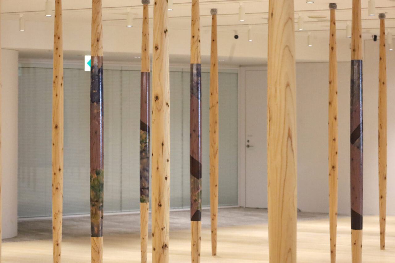 オカムラのガーデンコートショールームに、OPEN FIELDという新しい表現の場が誕生する。OPEN FIELDには、あらかじめ想定された形式ではなく、予期されない出会いや出来事が起きる原っぱのようなイメージを重ねあわせた。そこで3名の異なるジャンルのクリエイターに参加してもらい、絵画とデザインをともに体験してもらう風景としての空間をつくることを企画した。もっとも、絵画の作品が入るので、当然、壁がつくられるかと思いきや、中村竜治さんからは少しふくらんだ細い柱が林立する空間が提案された。したがって、画家の花房紗也香さんは、本展のための新作を描いた後、柱にその断片的なイメージを足していくというこれまでにない作業を行うが、こういう機会に挑戦してみたいとのこと。すなわち、通常の囲まれた「部屋」における展示ではなくなるため、「絵画」も解体される。また安東陽子さんは、これまで空間を仕切る柔らかい壁のようなテキスタイルの作品が多かったが、今回は柱頭にあたる部分を担当し、しかも柱を安定させるという構造の役割を果たす。これは彼女にとって初の試みである。今回のOPEN FIELDでは、空間、テキスタイル、絵画の関係性の組み換えが行われる。それも周囲と切り離された展示空間をつくるのではなく、いつもの部屋に特殊な柱の群れを挿入することで、見慣れた室内の風景を異化させる。一方で建築の歴史を振り返りながら考えると興味深い。例えば、古典主義の円柱は、柱身に膨らみ(エンタシス)があって、柱頭が分節されている。また中世の柱は多様な装飾をもっていたり、バロックにおいては絵画と建築が混交するような関係性をもつ。今回の試みは、こうした過去の事例に対する、21世紀的な表現かもしれない。