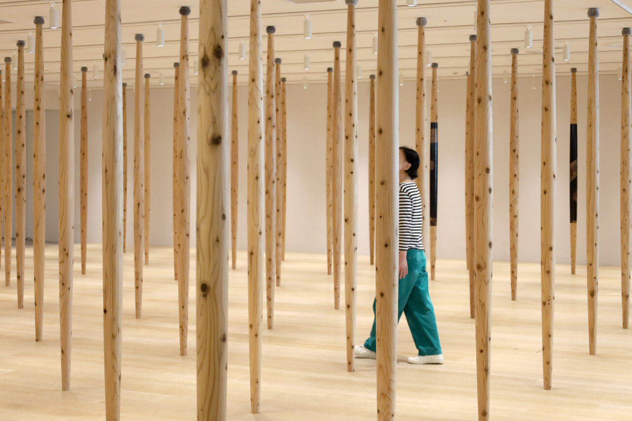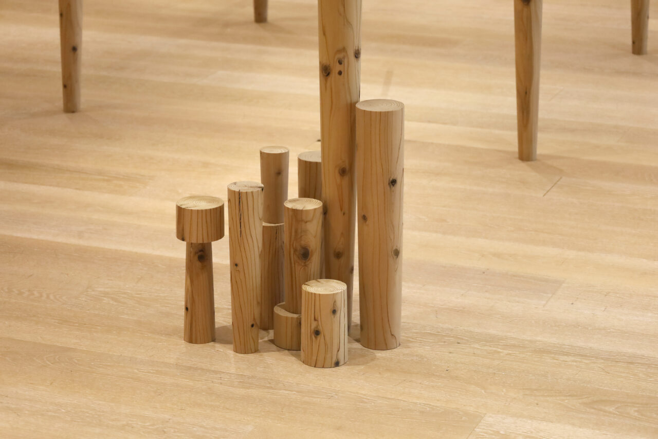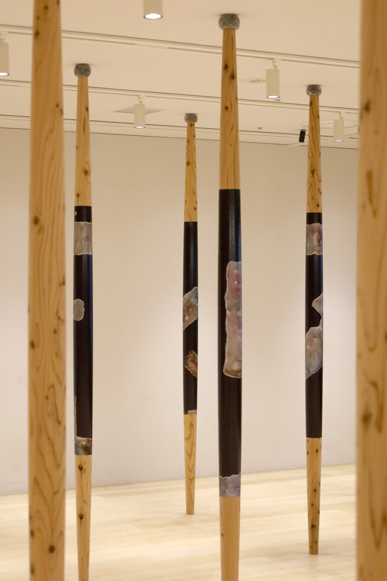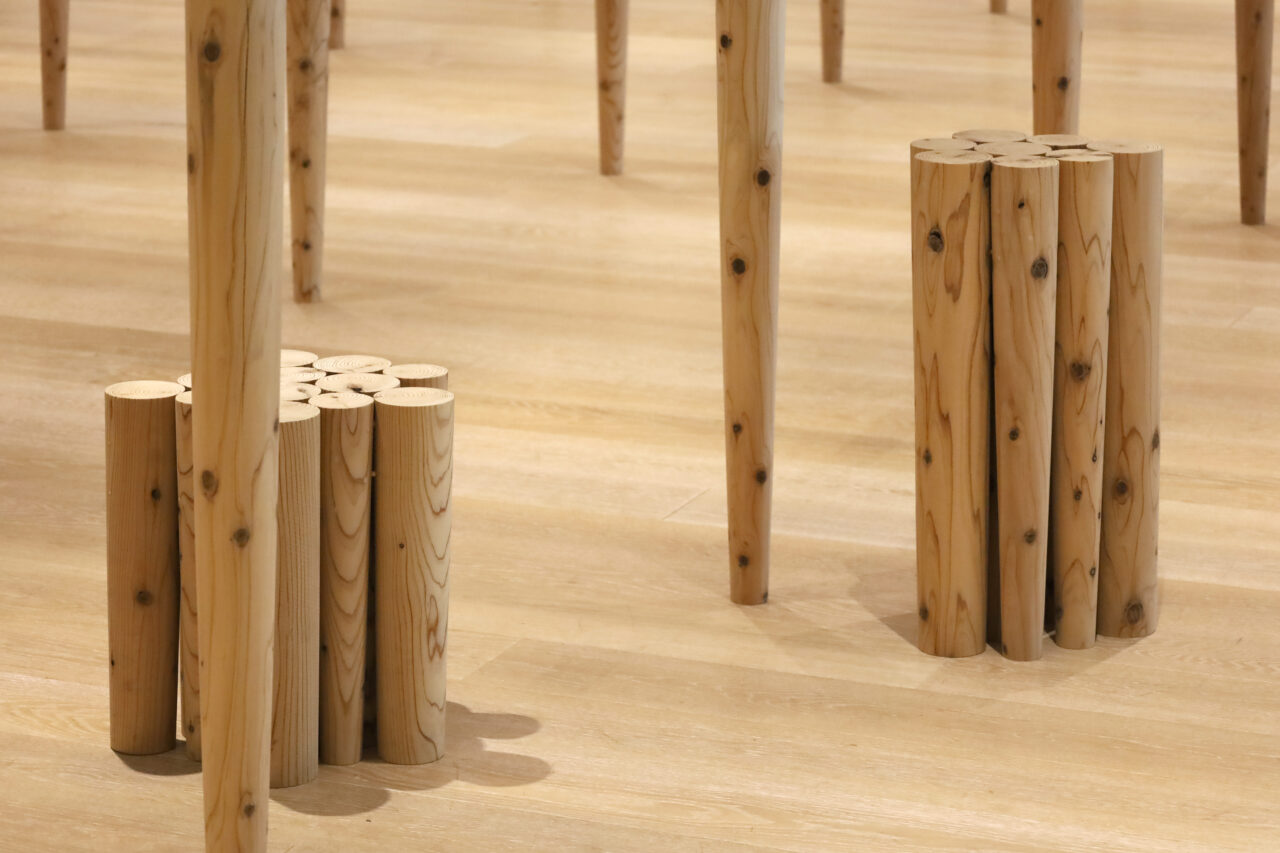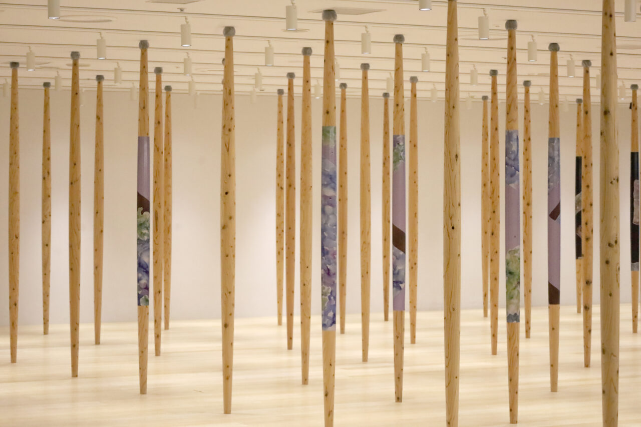 Forest of thin columns with a slight bulge-recombining space, painting and textiles