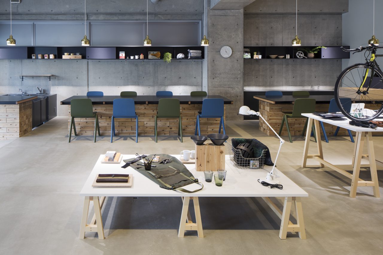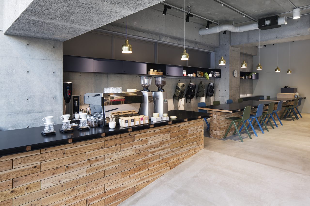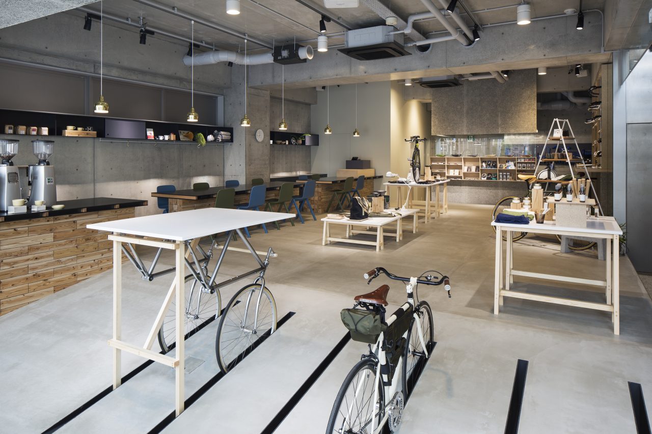 Initial ideas of displaying items on normal display furniture in a flat shop space were nixed in light of customer “lingering time.” Though easy to enter, a customer would give a single pass through the shop, and that would be it. Placing a cafe stop, a select corner, and a bicycle stand within the shop, not unlike vendors in a department store, generates a warm, interesting, and symbiotic relationship. We installed an 11m wide counter/table functioning as an axis of the shop, having three equivalent functions as a “reception’, “cafe counter,” and also a “business table.”