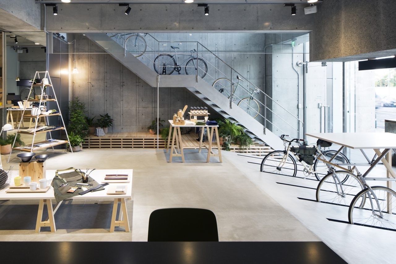 神宮前にあるブリヂストンサイクルのショップの改修工事。 緩やかな起伏のある外苑西通り沿いのビルの1階路面店である。 今回は、新たなコンセプトショップとして、「カフェ」と「 セレクトショップ(物販)」、「シティバイク」 の販売が行われるコミュニティースペースが求められた。また、 間口7mのガラスファサードから奥行き16mのフラットなコンク リートの店内に、 どう人を巻き込み滞在させることができるかが課題となった。