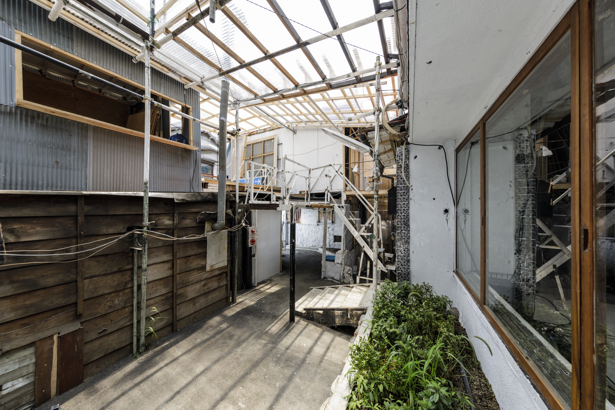 キタコレビルの屋内に建設し、屋外の公道と繋げた「道」。施錠せずに24時間一般に無料で開放することで、プライベートの空間内に公共空間を作り出す。キタコレビルは、二つの家屋を、その間にあった道に屋根をかぶせることで、一つの建物へと繋げるよう改築された建造物である。それが誰によって、なぜ行われたかは不明だが、築70年ほどのこの建物には、これまで様々な人が入居し、それぞれに増改築を重ねてきたDIYな建築の歴史がある。そんな成り立ちから、本作はそもそも道が存在していた二つの棟の間に再生するよう作られた。私道であるとともに公共空間であるがゆえに、キタコレビル内に存在しつつも道の周りに展示されている作品はパブリックアート、トイレは公衆便所、バーは路面店、ショップは道の駅などと位置付けられている。