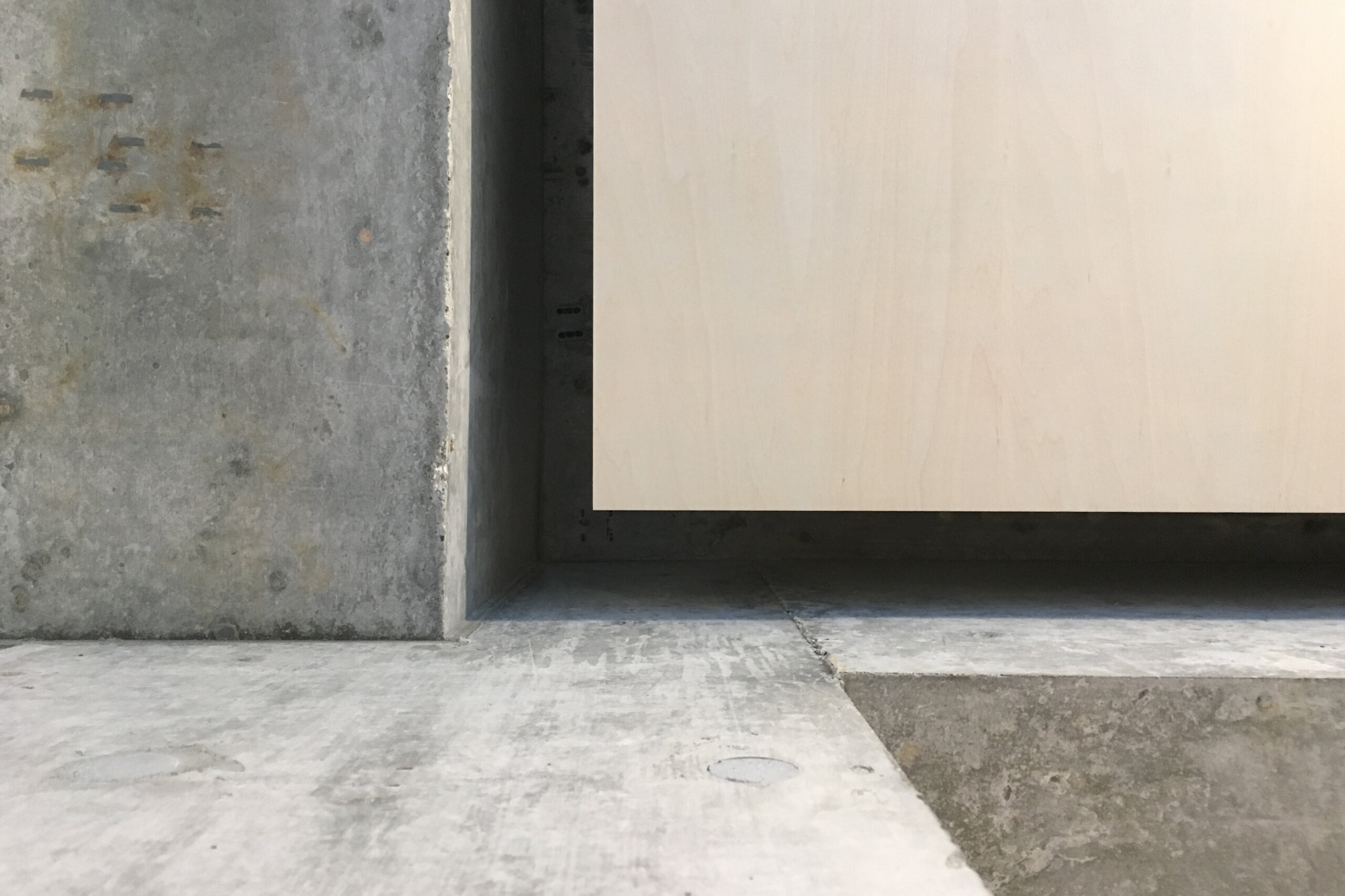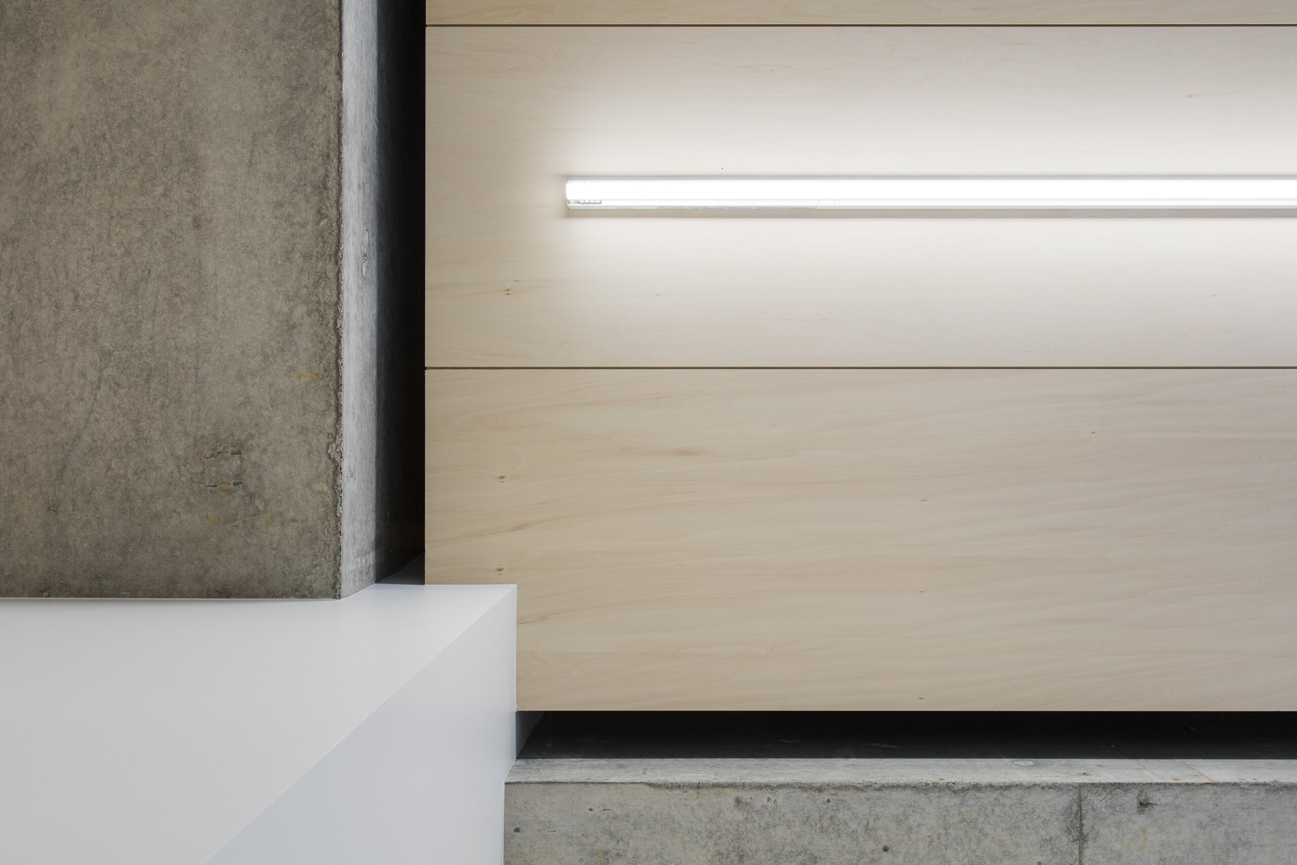 内装は、機能的でありシンプルなプロダクトを主張させるため、床は既存コンクリートを残し壁面は躯体に白塗装を施している。天井は、スケルトン天井でなく、約40㎝下げることにより配管や空調などを隠すとともに、日本の和室空間にあるような、高さを抑えた落ち着きのある空間を目指した。またその中でも、壁面と天井との間に70㎜のスリットを残すことにより、完全に閉じた重たい印象の天井ではなく、RC空間に浮く軽い印象の天井と見せるよう配慮をしている。