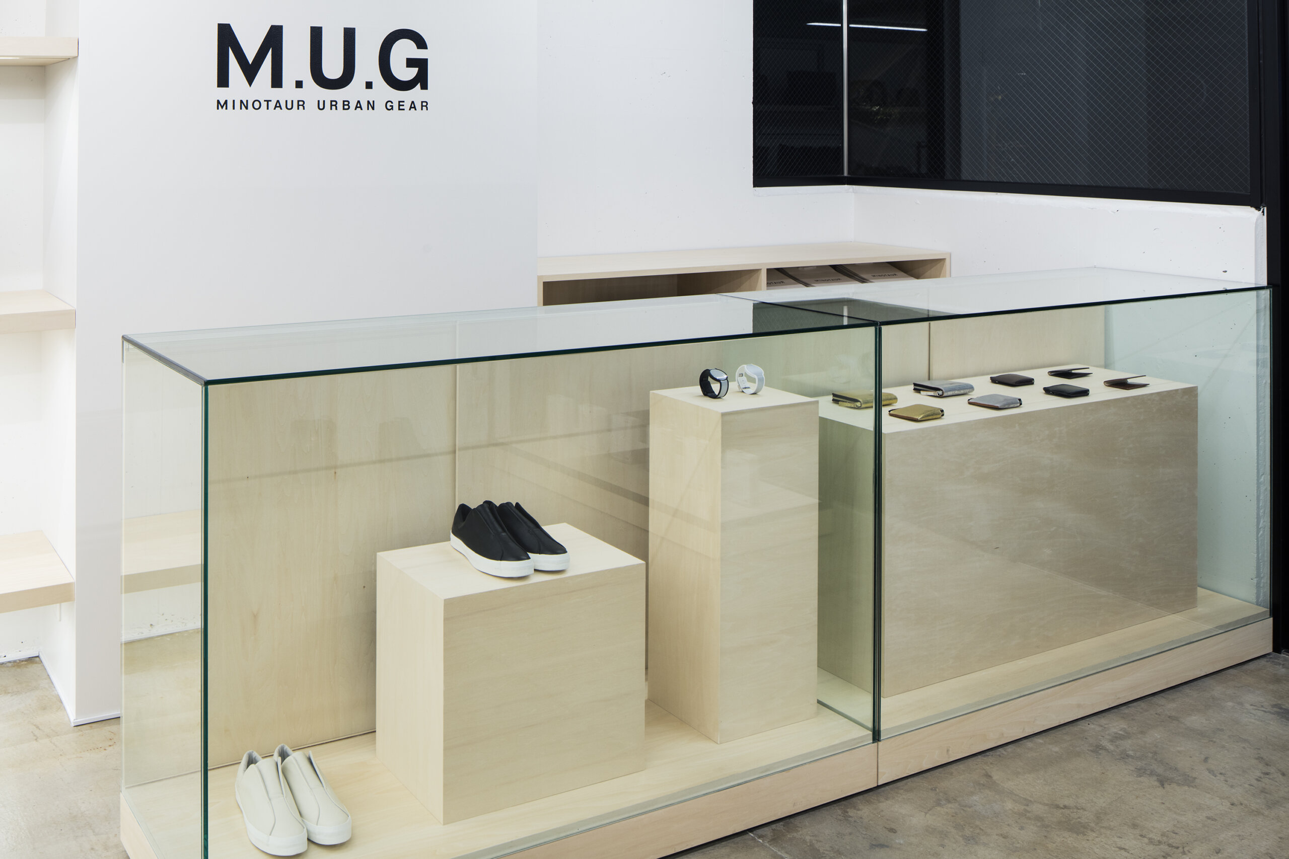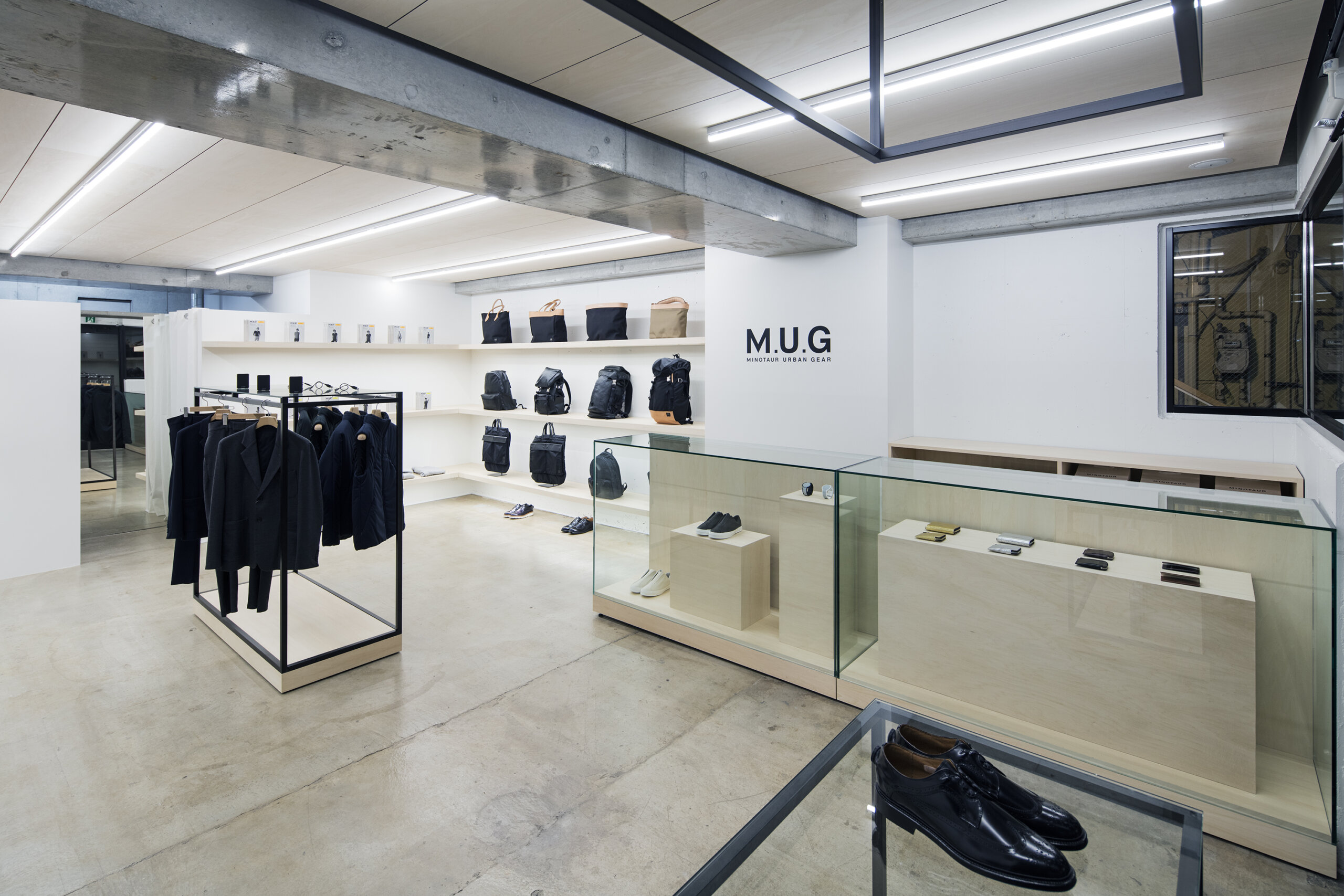 「快適な現代生活のために」をもっとうに、アパレルブランドのMINOTAURがプロダクトラインを提案した、M.U.G (MINOTAUR URBAN GEAR) 旗艦店の内装計画。