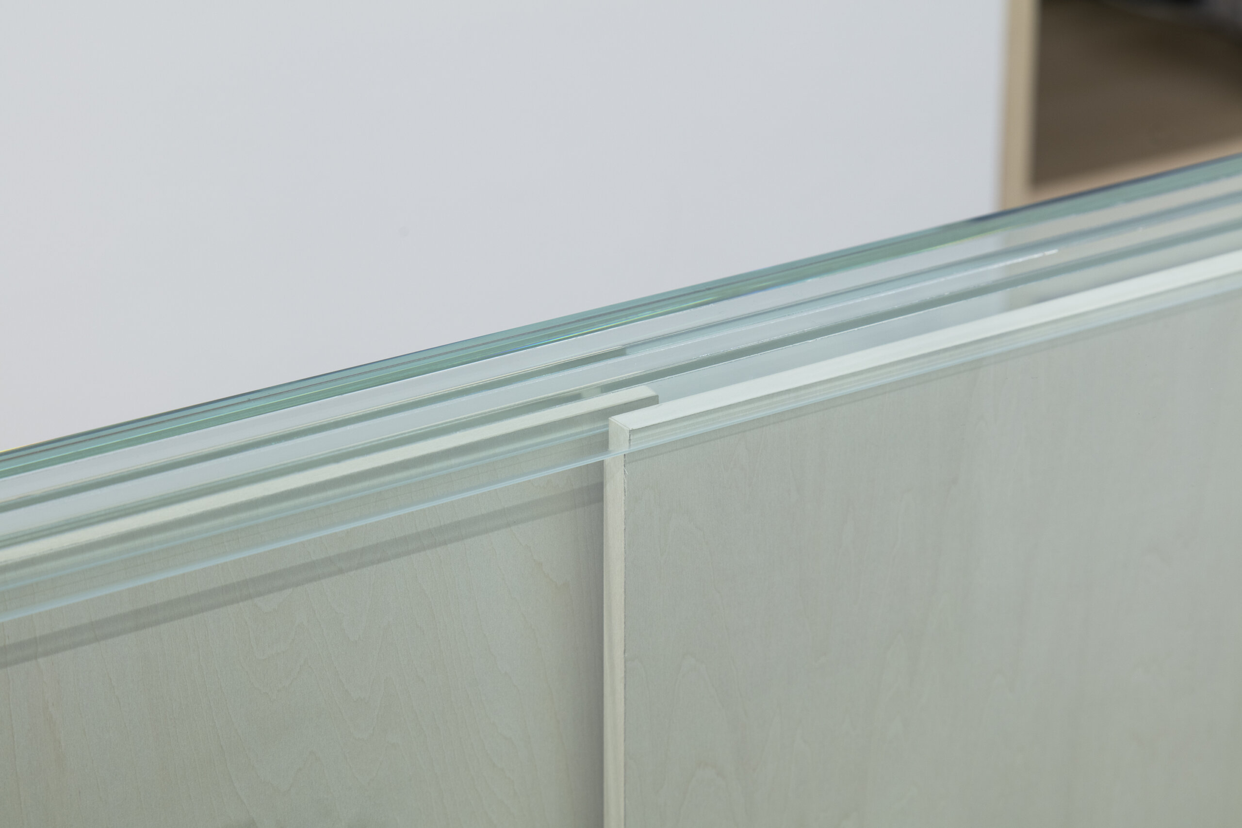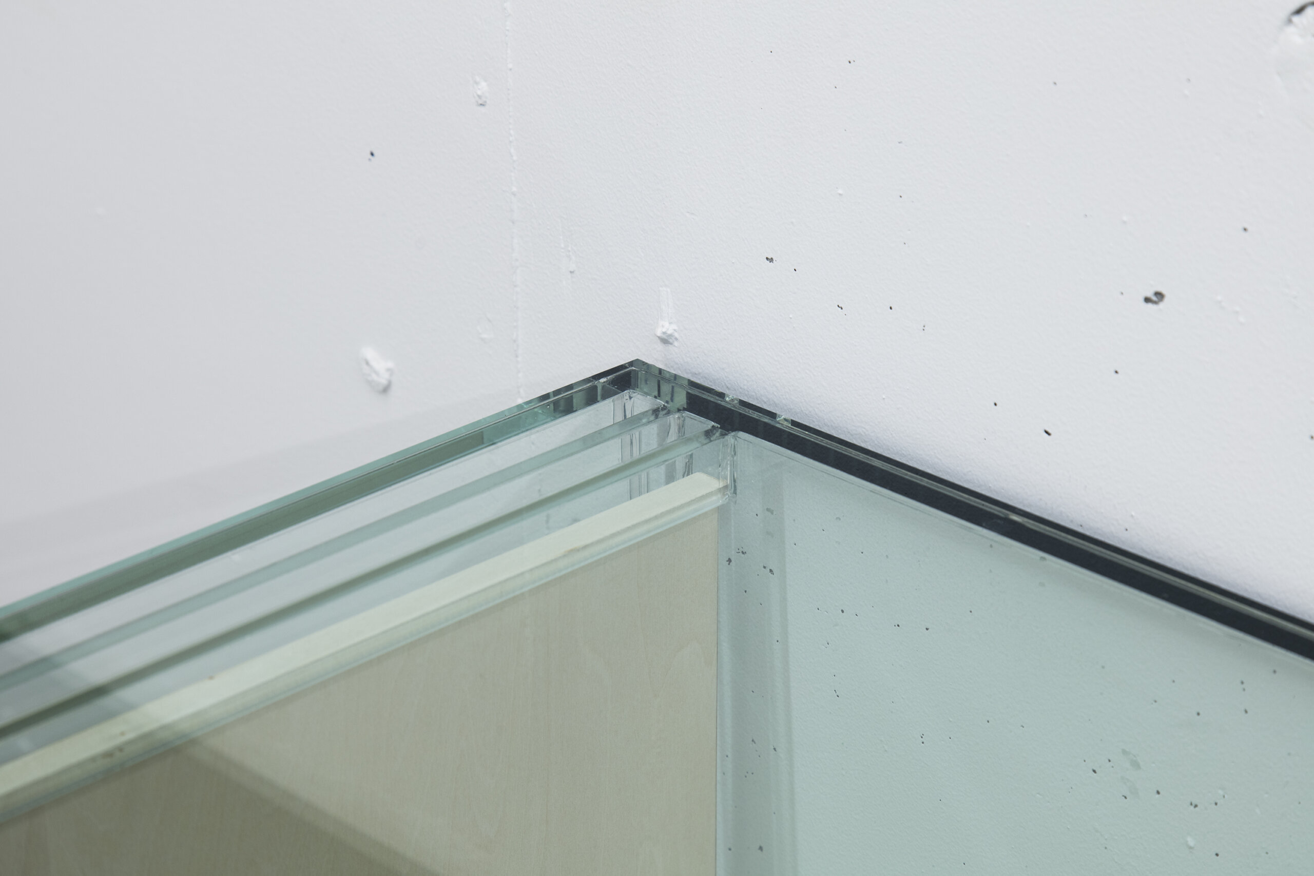 The 85cm height of the main showcase by the entrance was dictated by the need to exchange the items on accordingly sized wooden plinths within. At the rear, wooden panels as side-opening doors, slide within grooves in the upper glass pane and wooden base.