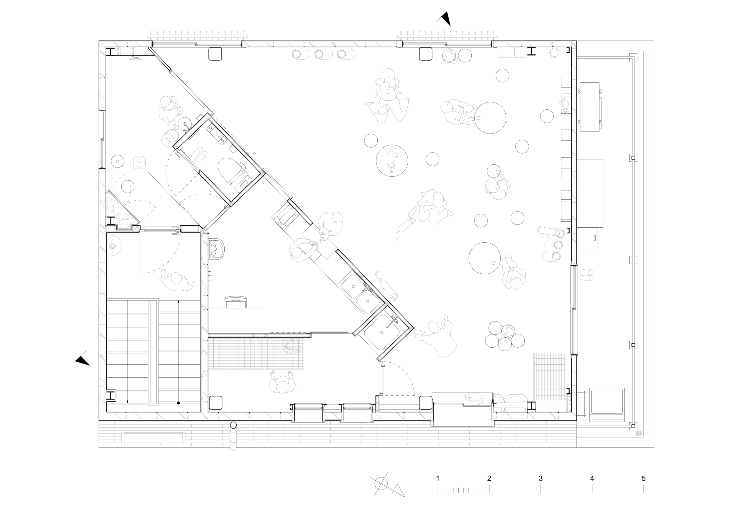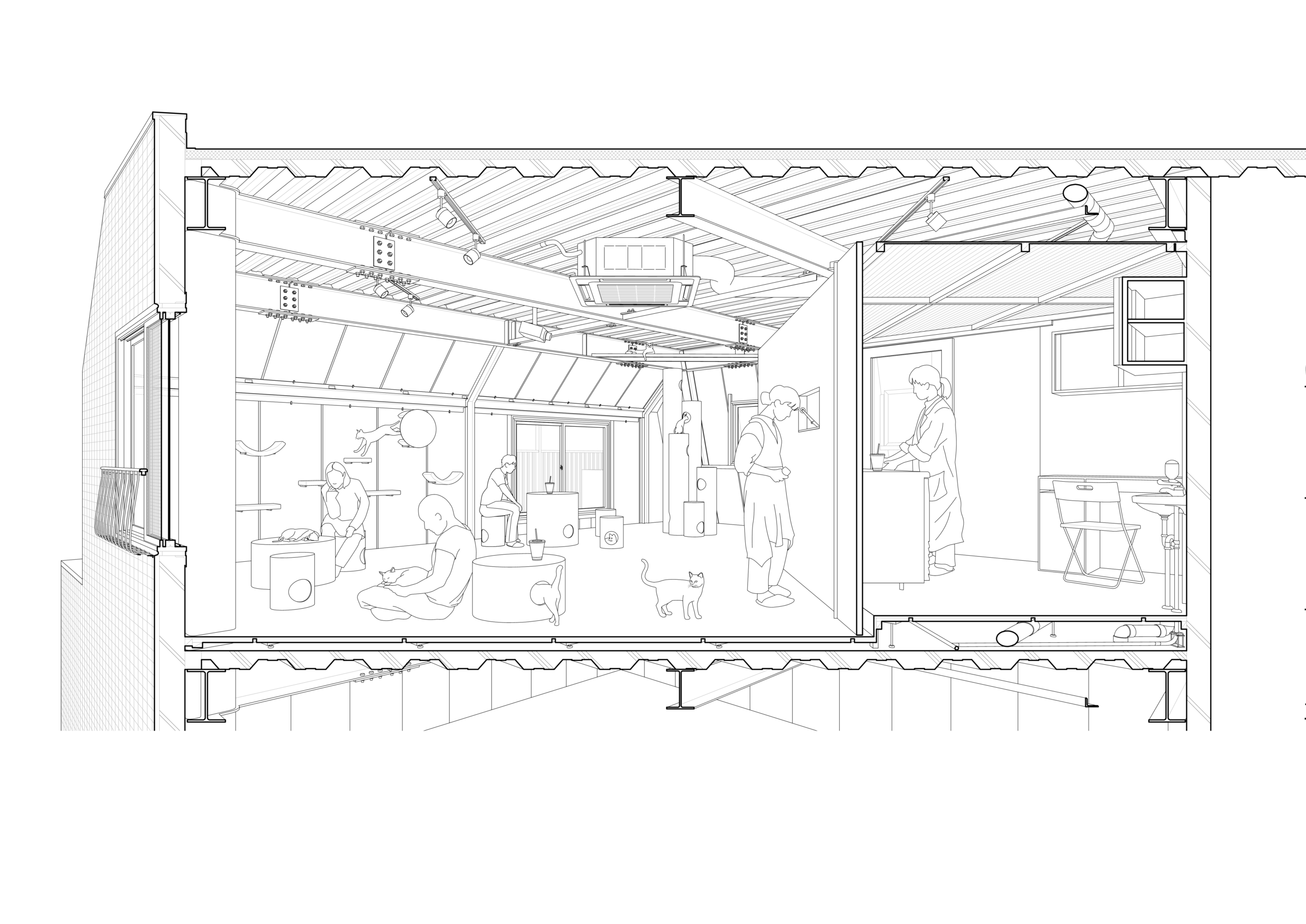 内装においては間仕切壁や檻といった猫と人とを厳格に区切るような見えの要素を極力排することでこれを実現しようとした。