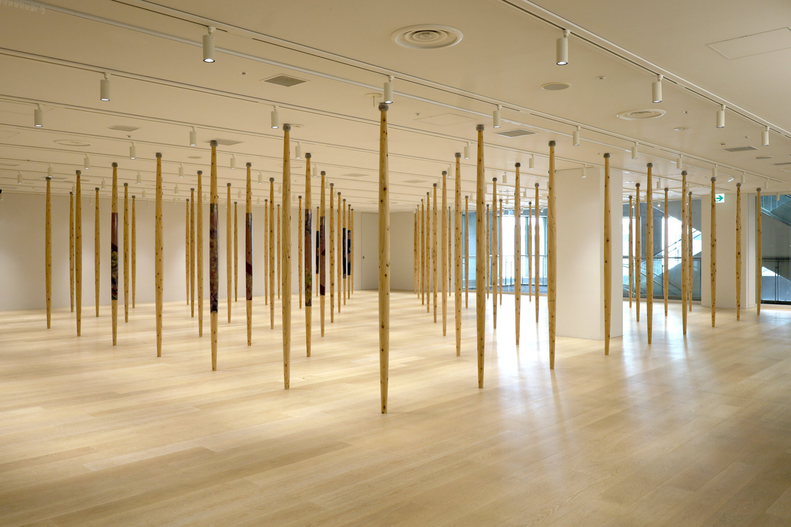 オカムラのガーデンコートショールームに、OPEN FIELDという新しい表現の場が誕生する。OPEN FIELDには、あらかじめ想定された形式ではなく、予期されない出会いや出来事が起きる原っぱのようなイメージを重ねあわせた。そこで3名の異なるジャンルのクリエイターに参加してもらい、絵画とデザインをともに体験してもらう風景としての空間をつくることを企画した。もっとも、絵画の作品が入るので、当然、壁がつくられるかと思いきや、中村竜治さんからは少しふくらんだ細い柱が林立する空間が提案された。したがって、画家の花房紗也香さんは、本展のための新作を描いた後、柱にその断片的なイメージを足していくというこれまでにない作業を行うが、こういう機会に挑戦してみたいとのこと。すなわち、通常の囲まれた「部屋」における展示ではなくなるため、「絵画」も解体される。また安東陽子さんは、これまで空間を仕切る柔らかい壁のようなテキスタイルの作品が多かったが、今回は柱頭にあたる部分を担当し、しかも柱を安定させるという構造の役割を果たす。これは彼女にとって初の試みである。今回のOPEN FIELDでは、空間、テキスタイル、絵画の関係性の組み換えが行われる。それも周囲と切り離された展示空間をつくるのではなく、いつもの部屋に特殊な柱の群れを挿入することで、見慣れた室内の風景を異化させる。一方で建築の歴史を振り返りながら考えると興味深い。例えば、古典主義の円柱は、柱身に膨らみ(エンタシス)があって、柱頭が分節されている。また中世の柱は多様な装飾をもっていたり、バロックにおいては絵画と建築が混交するような関係性をもつ。今回の試みは、こうした過去の事例に対する、21世紀的な表現かもしれない。