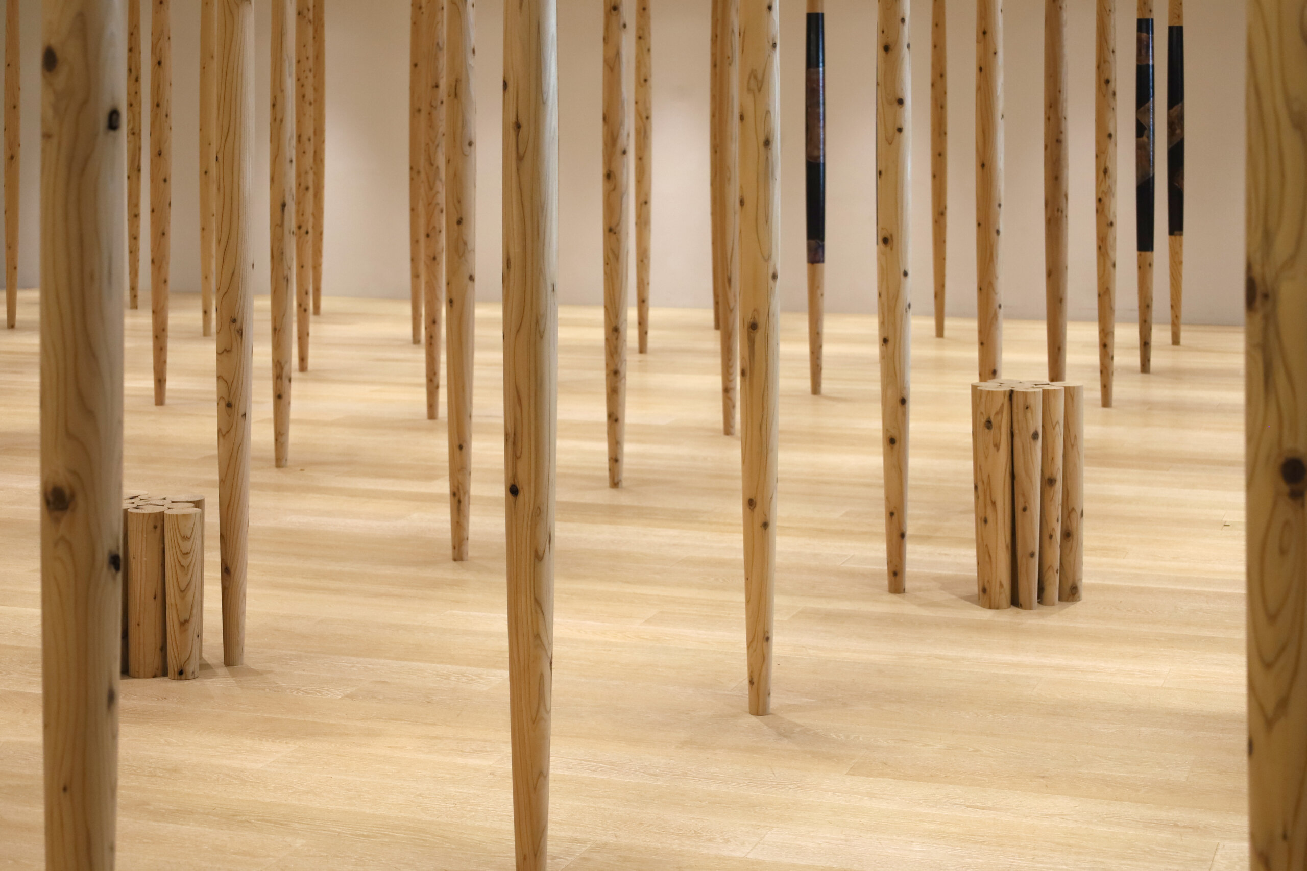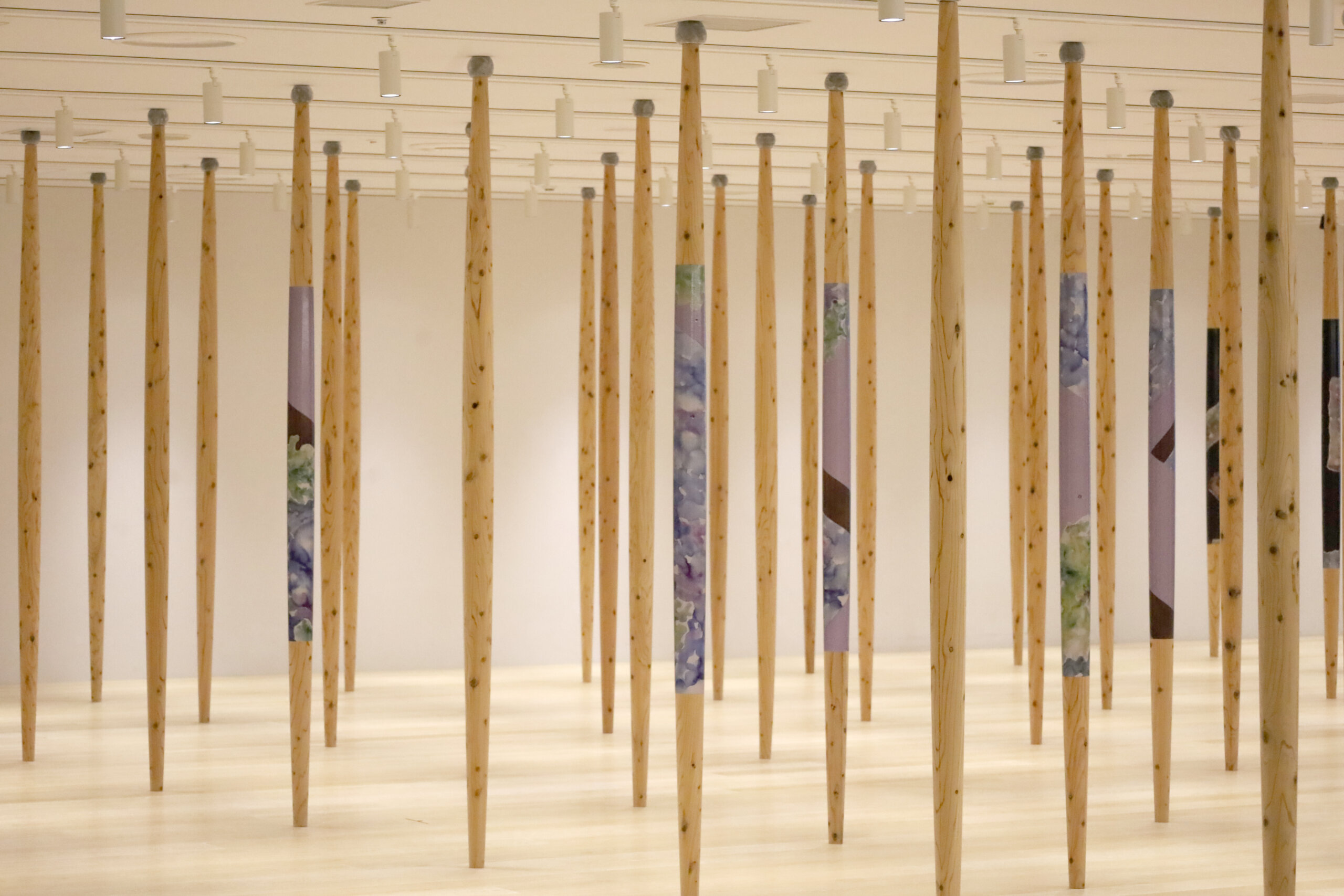 Forest of thin columns with a slight bulge-recombining space, painting and textiles