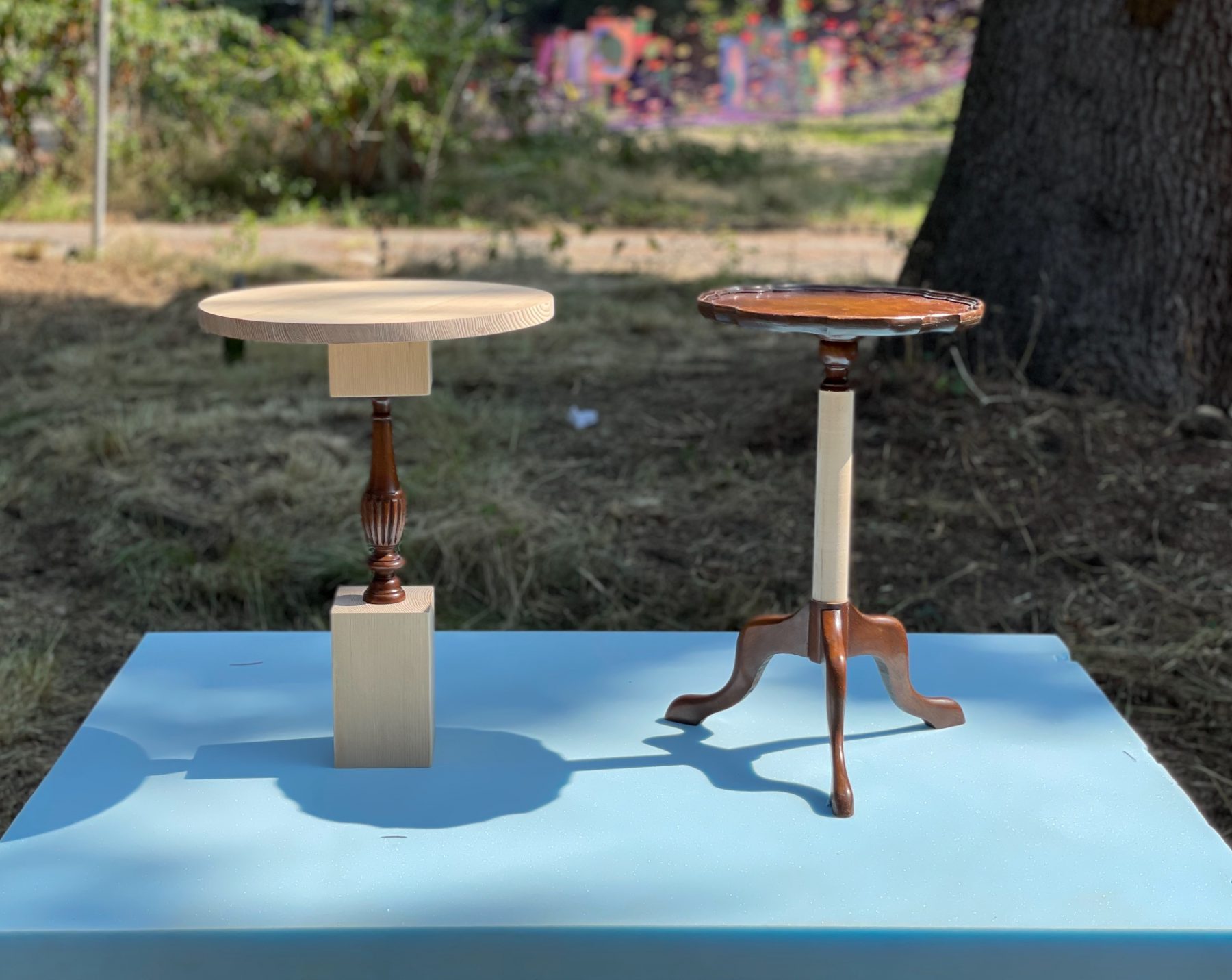 An object is rotated in a certain direction, and a circular saw, rotating in the same direction as the rotation, is moved in the X direction while approaching the object in the Y direction to form a cylinder. The work was created for the Venice Biennale 2021, where I processed an existing coffee table to create the Twins.